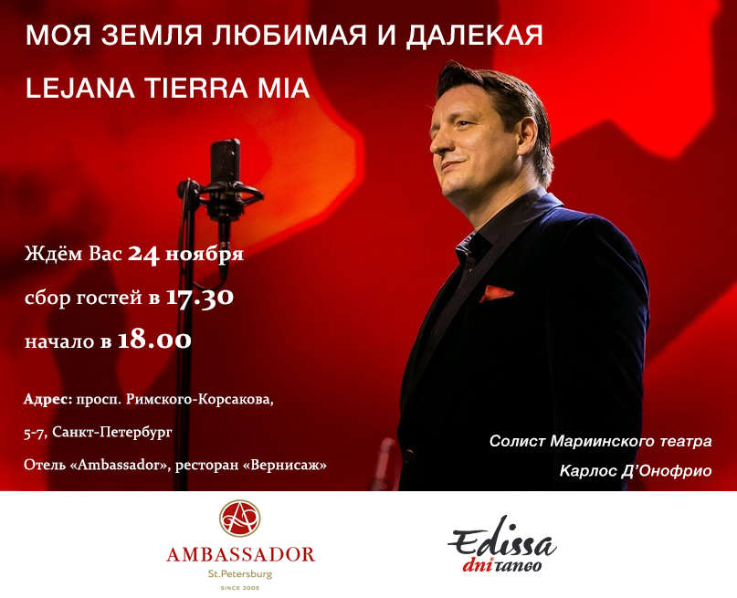 Любимец Петербургской публики, известный аргентинский тенор Карлос Д’Онофрио, ныне солист Мариинского театра и великолепный мастер итальянского бельканто, даёт сольный концерт аргентинской музыки в Петербуржском Отеле «Ambassador», знаменитом своими культурными программами.