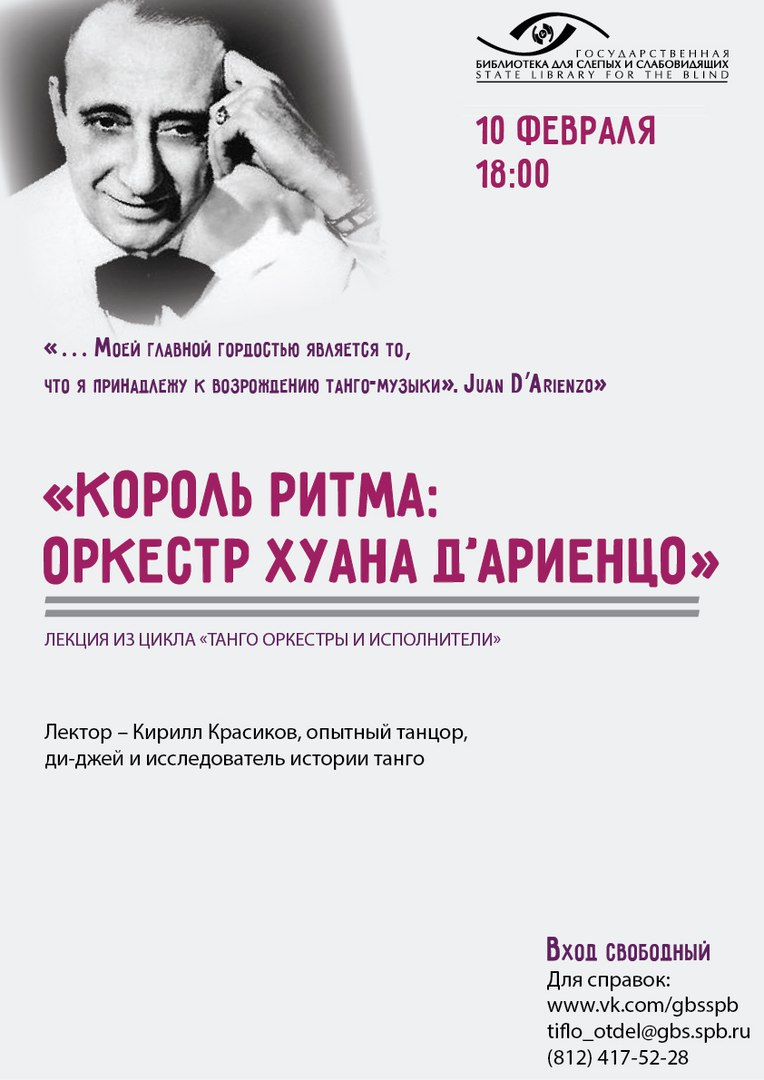 Лекция Кирилла Красикова «Оркестр Хуана Д’Ариенцо» состоится 10 февраля в субботу в Библиотеке для слепых на Стрельнинской-11.