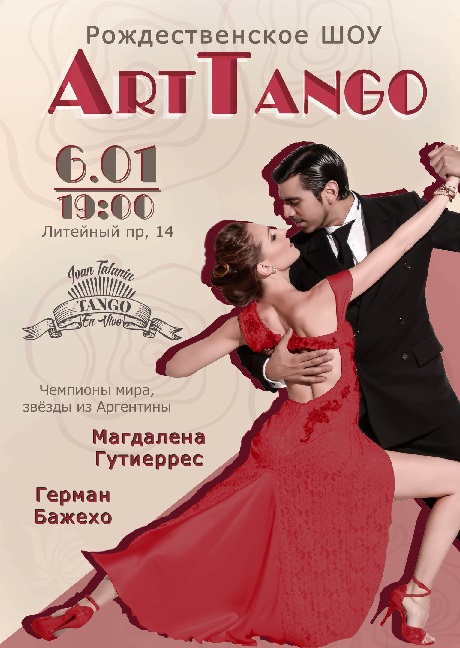 Шоу «ArtTango» это незабываемые впечатления, романтика, искренность и страстные объятия аргентинского танго, вдохновляющая живая музыка и произведения гениальных художников на большом экране. Организатор шоу — Центр танца «Тангомания». Тел. +7(812) 655-63-05, +7(901) 373-19-34.